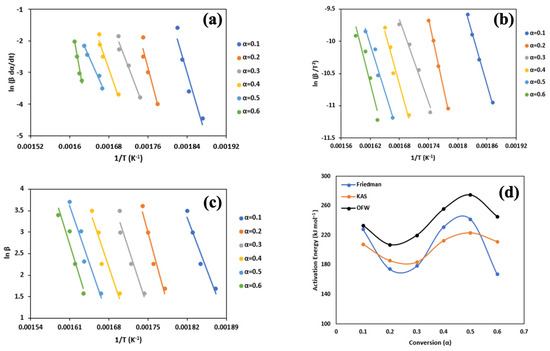 Figure 5 represents the linear fitting plots generated via Friedman, KAS, and OFW methods for the pyrolytic conversion of flax straw biomass. Figure 5a is the plot of vs. at different conversions based on the Friedman method. Figure 5b,c show plots of vs. and ln(β) vs. based on the KAS and OFW methods, respectively. Comparing the three methods, this shows an average of 105.2 kJ mol−1 and a percentage difference of 8.3%, which is consistent with previous reports [64].