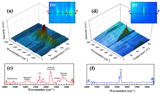 (a) Three-dimensional FT-IR profiles of the evolved gases released from flax straw during pyrolysis (temperature based); (b) bird-eye view map of the FT-IR profile evolved gases for pyrolysis; (c) FR-IR spectra of evolved gas with the highest intensity. (d) Three-dimensional FT-IR profiles of the evolved gases released from flax straw during combustion; (e) bird-eye view map of the FT-IR profile evolved gases for combustion; (f) FR-IR spectra of evolved gas with the highest intensity.