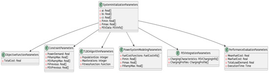 Innovatively, this research combines the fields of economic load dispatch and PEV integration, providing a complete view of how optimizing power generation interacts with the evolving landscape of electric vehicle adoption. Furthermore, the use of the TLBO algorithm in this context represents a novel application, demonstrating its effectiveness in addressing complex, real-world challenges. Figure 1 provides a comprehensive visual representation of the key parameters involved in the system initialization process. It covers essential categories, including thermal unit data, power output limits, PEV data, objective function parameters, constraint parameters, TLBO algorithm parameters, power system modeling parameters, and PEV integration parameters. This diagram serves as a valuable reference for understanding the various inputs and configurations required for optimizing power system operation with the inclusion of Plug-in Electric Vehicles (PEVs). It aids in ensuring efficient and reliable power generation while considering factors like fuel costs, power demand, and the dynamic behavior of PEVs.