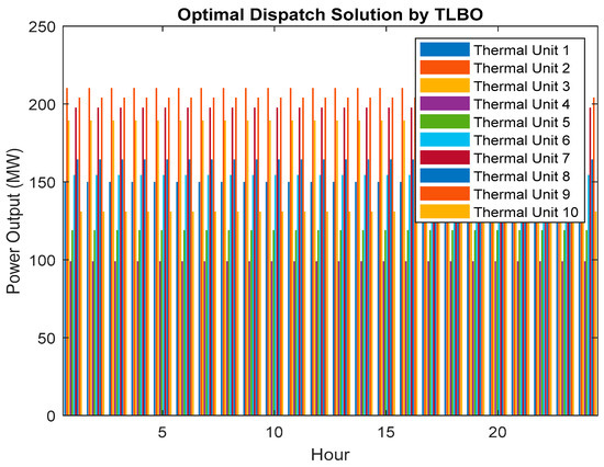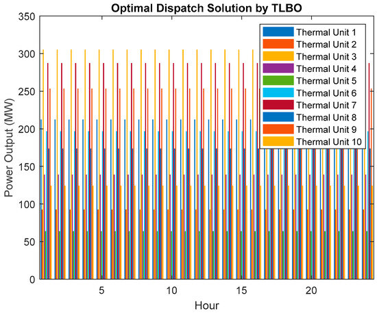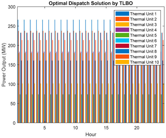 TLBO was selected as the optimization algorithm for solving the economic load dispatch problem. TLBO is a population-based metaheuristic algorithm inspired by the teaching and learning process in a classroom. It incorporates the concepts of teachers and students to optimize the objective function. The Teaching–Learning-Based Optimization (TLBO) algorithm is used to solve an optimal power dispatch problem in a power system. The TLBO algorithm aims to find the optimal power output solution for a set of thermal units while considering factors such as fuel cost, load demand, and the presence of plug-in electric vehicles (PEVs).