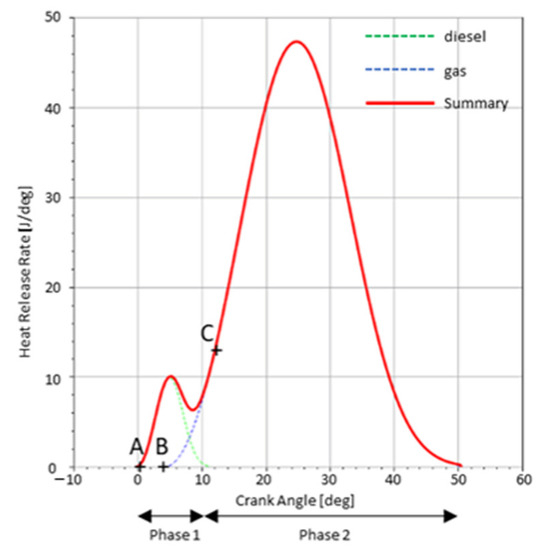 For this reason, the separation of the phases isa crucial step in this proposed model. At the end of this step, the model determines the auto-ignition delay of the injected diesel quantity and the ignition delay of the air–gas mixture (points A and B, respectively (Figure 2)) and the laws that control the HRR in each phase.