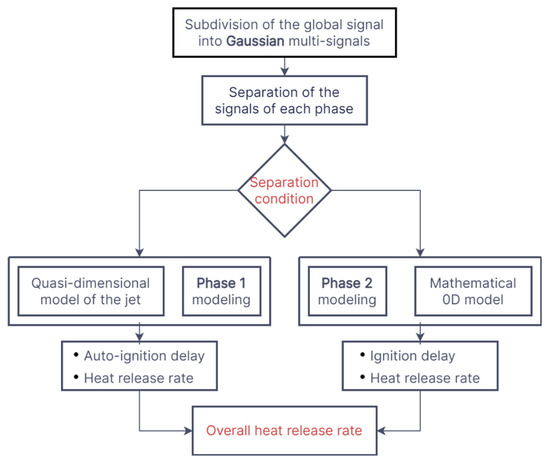 The two phases will be treated separately in the rest of the work as indicated in the flow chart in Figure 3. The first phase will be treated by a quasi-dimensional model of the jet specific to diesel combustion. The second phase will be treated by a 0D model based on Gaussian multifunction modeling, necessarily involving the modeling of auto-ignition delay and ignition delay for pilot fuel and primary gas, respectively.
