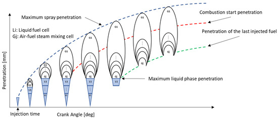 A limit exists for the length of the liquid phase, where the maximum length is characterized by the saturated vapor state. Achieving this saturated vapor state occurs when the liquid phase’s penetration distance exceeds the maximum liquid phase length. Consequently, a mass transfer occurs between the final cell of liquid and the initial cell of the liquid-vapor mixture. During this process, part of the liquid fuel changes from the liquid phase to the vapor phase and then combines with air in its saturated vapor state. Over time, the combustion zone emerges, as it consumes a specific amount of steam fuel Δmc [41] following Equation (5).
