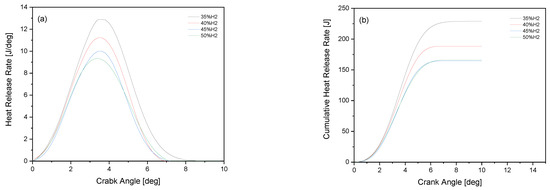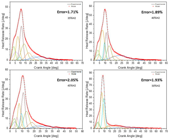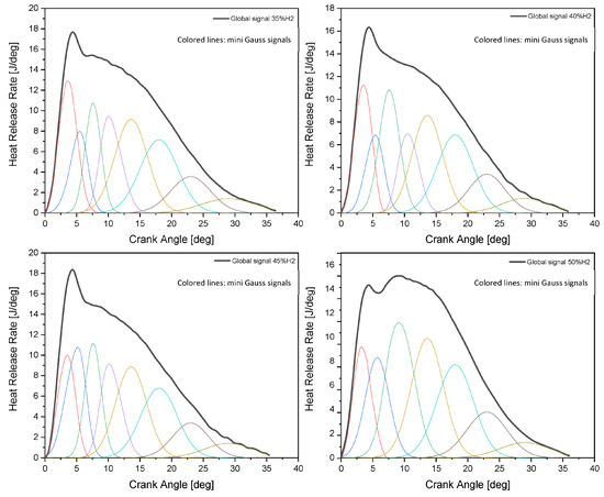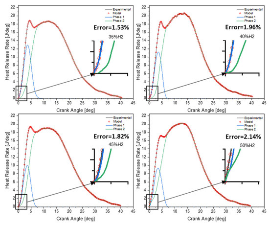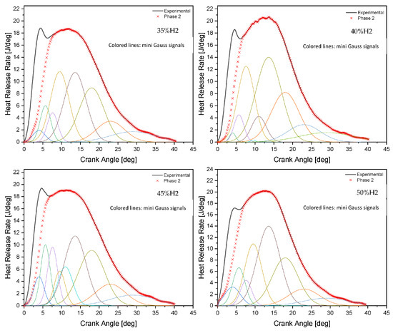 After this multi-signal modeling, based on Gaussian functions, the model decomposes the two combustion phases according to the conditions mentioned above. Figure 6 shows the variations in the HRR that characterize the combustion of the diesel quantity as a function of crank angle and the cumulative heat released for the different compositions of surrounding gas in the combustion chamber. Figure 6b confirms that the effective diesel burning in the first phase will decrease with the increasing percentage of hydrogen in the air–gas mixture. This is due to the timing of the triggering of the second phase, which will be detailed in the following section. So, the second phase starts earlier when the air–gas mixture is richer in hydrogen, which decreases the contribution of the first phase in the overall HRR, and thus decreases the effective amount of diesel that contributes to the first phase of combustion. For all cases of gas composition, the difference between the quantity of diesel injected and that burnt, according to the model, is taken into account in the second phase without any particular treatment about the composition of the gas.