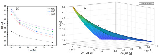 Figure 7b represents the response surface expressed by the approach of Equation (3), for which this auto-ignition delay is represented as a function of the quantities of hydrogen and natural gas existing in the combustion chamber. Knowing that the amount of diesel injected as a pilot fuel is fixed (5 g/min) for all operating cases.