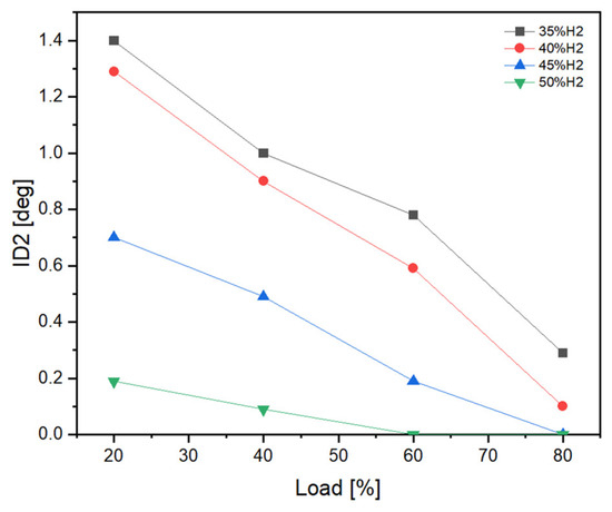 Figure 9 represents the variation of the ignition delay (ID2) of the gas mixture in the combustion chamber as a function of the load and gas compositions according to the percentage of hydrogen (H2). Note that the ID2 represents the time between the diesel ignition and the moment of the gas mixture ignition. According to the results, for the same gas composition (same percentage of H2) the ID2 will decrease with the increasing load. For the same load, the ID2 will decrease with the increasing percentage of H2.