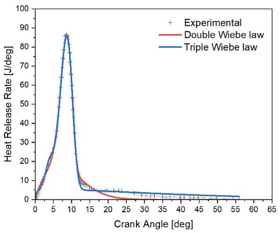 Xu et al. [22] developed a model based on a triple Wiebe function [23] to characterize and model experimental combustion results specific to dual fuel operation. The auto-ignition delay and injection time are determined by an iterative calculation based on the start of combustion and a predictive correlation for the auto-ignition delay. A four-stage combustion mechanism was discussed in this work for which it is shown that a triple Wiebe function can model combustion in dual fuel mode with all its steps.