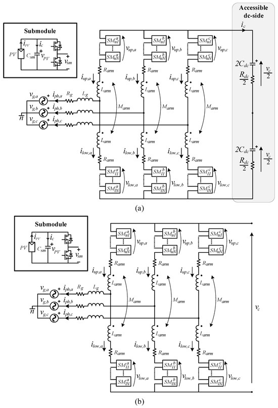 The analyzed converter topologies are reported in Figure 1. They are related to the control strategy reported in [20], in the presence of the DC-side capacitor (Figure 1a), and to the control strategy reported in [16], without the DC-side capacitor (Figure 1b). Both consist of three legs, one per phase, and, in turn, each leg is made up of two arms, i.e., the upper and lower arm, connected through mutually coupled inductors. Then, each arm is based on the cascade connection of N submodules based on the half-bridge topology. The PV arrays are directly interfaced through the SM capacitors, enabling a fully distributed system. The distinction between the two topologies is based on the presence of an additional reclosure path for the AC circulating currents due to the inclusion of a DC-side capacitor in the converter topology shown in Figure 1a.