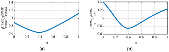 For all these combinations, the values of the AC circulating voltages were calculated for both the DPME and CPME control strategies using (19) and (24), respectively. This procedure was performed through varying the resonant factor α from 0 to 1 with a step of 0.01 for Jv,max and Jv,eq in the case of the DPME control strategy. It is worth noting that, for the CPME control strategy, the metrics of (26) can be evaluated for the different considered combinations of power mismatches, but they do not depend on the resonant factor. The results are shown in Figure 3.