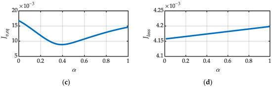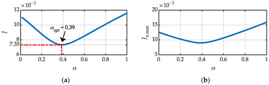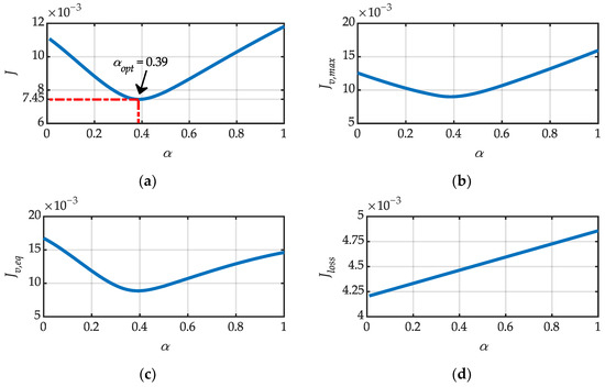 where wv,max, wv,eq, and wloss are the weight factors related to each metric. Specifically, they range between 0 and 1, and their sum is equal to one. Therefore, considering a set of H possible values of α, α ∈ {α1, …, αH}, the optimal value of the resonant factor αopt can be obtained through minimizing the cost function J(α), i.e.: