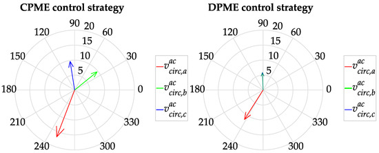 The phasors of the AC circulating voltages generated by the DPME and CPME strategies are reported in Figure 11. Also in this case, for the CPME algorithm, the AC circulating voltages are about 90° out of phase with respect to the corresponding circulating currents, while in the case of the DPME strategy, they depend on the voltage drop on the DC-side capacitor and, therefore, on the sum of the AC circulating currents.