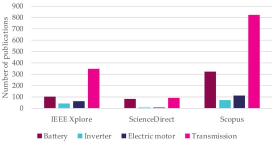 While DT has the potential to be utilized across various electric propulsion drive elements, it is evident from Figure 4 that transmission and battery are the most widely adopted ones. Figure 4 presents search results for publications related to DT components in automotive applications.