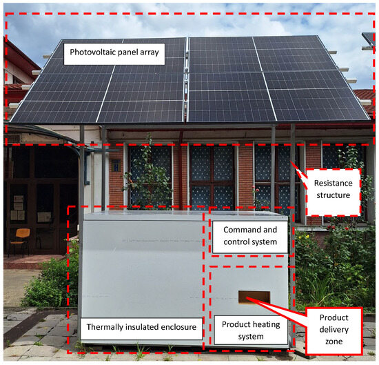 The research was carried out on the SVIEE energy efficient vending machine prototype installed and studied at The Technical University of Civil Engineering of Bucharest (UTCB), illustrated in Figure 1. This study continues the research on consumption optimization in the case of an energy-independent vending system. In the article Study on Energy Efficiency of an Off-Grid Vending Machine with Compact Heat Exchangers and Low GWP Refrigerant Powered by Solar Energy [15], the research on the efficiency of the thermally insulated enclosure and the refrigeration system of the experimental model developed for the study of energy-independent vending systems was presented. Research on optimizing the operation of independent energy sales systems has also focused on the influence of the DC–AC inverter [16] and heat transfer in the experimental model of the independent energy sales system [17]. This article presents the research on the optimization of the electrical energy consumption of the heating system of the products to be delivered by the vending machine. The studied SVIEE prototype has the following subsystems: photovoltaic panel array; solar energy storage battery array; command and control system; thermally insulated enclosure; cooling system; product heating system; resistance structure.