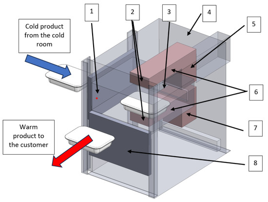 For heating the products delivered by the energy-independent vending machine, a microwave oven specially built for model M2A/28A vending machines [19] was adopted and installed. This microwave oven is in the category of those without a rotating table and is equipped with two mirror-mounted magnets. The components of the oven are shown in Figure 3. The oven is equipped with a stainless-steel outer casing; 1—side door; 2—wave stirrer; 3—motorized pallet for the evacuation of heated products; 4—outer casing; 5—upper magnetron; 6—wave stirrer; 7—lower magnetron; 8—front door. The microwave oven is manufactured in such a way that it allows the products to be introduced through the automated side door from the refrigerating chamber and to be discharged, after heating, in a direction perpendicular to the direction of introduction of the products, through the automated front door. The discharge is performed by pushing with the help of a motorized pallet. The oven has a power of 2000 W and uses two LG 2M286-23TAG 1050 W magnetrons with a microwave frequency of 2450 +/− 50 MHz.