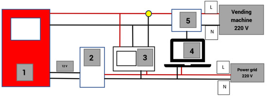 In order to obtain the necessary data to train the neural network, we carried out practical tests on electricity consumption by heating different products in the microwave oven for different time periods. For easier testing, the microwave oven was removed from the vending machine and tested in the laboratory, but it was powered from the electrical system of the vending machine. The test stand, shown in Figure 4, consists of: 1—microwave oven; 2—automated door opening system; 3—HIOCHI PW3198 analysis device; 4—laptop; 5—controller for adjusting the heating time.