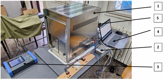 where Urms—root mean square voltage; Irms—root mean square current; P—active power; WP—active energy; M—number of samples per cycle; h—measurement time; k—coefficient for converting to 1 h. For the frequency of 50 Hz, at which the microwave oven operated, according to IEC61000-4-30 [22], we calculated from the approx. 200 ms aggregation of 10 waveforms. The microwave oven test stand, shown in Figure 5, consists of: 1—microwave oven; 2—automated door opening system; 3—HIOCHI PW3198 analysis device; 4—laptop; 5—controller for adjusting the heating time.