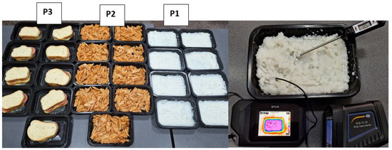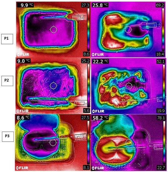 The temperature measurement of the products was carried out with a contact thermometer (measuring range—50–300 degrees Celsius; measuring accuracy +/− 0.1 degrees Celsius), an infrared thermometer (measuring range—20–380 degrees Celsius; measuring accuracy +/− 2 degrees Celsius). The surface temperature analysis of the products in the pots was carried out with an FILR C5 thermal imaging camera. The weighing of the products was carried out with a scale with an accuracy of +/− 1 g. For the tests, we considered three types of products packed in crates with a size of 187 mm × 137 mm × 37 mm. The heated products are: P1—boiled rice; P2—pasta with tomato sauce; P3—sausage and cheese sandwich. The test procedure involved the following steps: preparation of the product plastic recipients; storage of the recipients in the cold room; removal from the cold room; weighing of the product plastic recipient; determination of the starting temperature of the product; introduction of the recipient into the microwave oven; heating of the microwave oven for the programmed time; removal of the plastic recipient; determination of the stopping temperature of the product in the heated areas. The products were stored in the refrigerator premises of the vending machine.