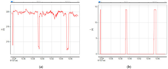 The HIOKI PW3198 power quality analyzer determines the active power during tests, as shown in Figure 4 and Figure 5. We have a single phase 2 wire 1P2W, and the effective RMS (root mean square) electrical quantities were determined using the formulas [16]: