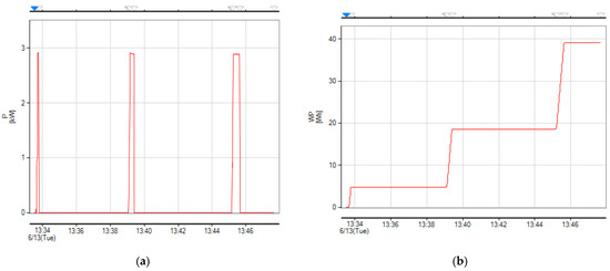 In Figure 8a,b and Figure 9a,b we show the HIOKI PW3198 device recordings for voltage, current, power and energy obtained for the heating test of product P1—rice pilaf witch heating time of 10 s, 20 s, 30 s (the blue and white triangle represents the start and end of a test).