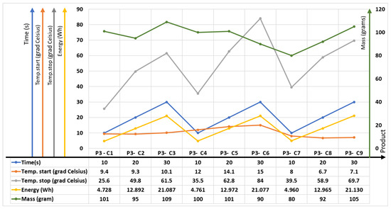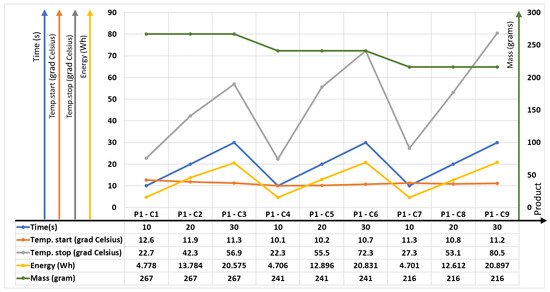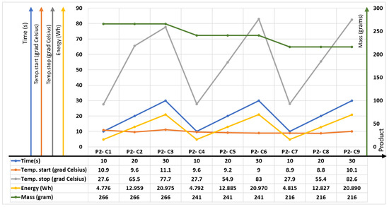 After performing the heating tests for the set of nine prepared plastic recipients (C1–C9), we obtained the values shown in Figure 10, Figure 11 and Figure 12. The tests were repeated four times for the same type of products and under the same test conditions. The values shown represent the arithmetic mean of the values obtained from the tests.