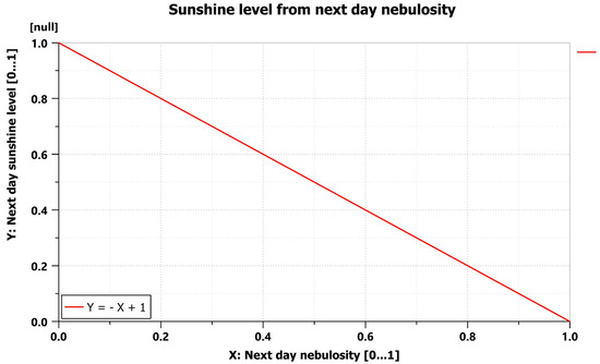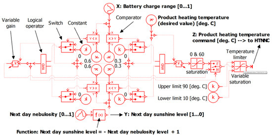 The first numerical simulation, the Energy Management Controller (EMC), is focused on the energy management, which considered the charge level of the vending machine batteries and the next day’s sunshine level resulting from nebulosity predictions to limit the maximum heating temperature of the products in order to conserve energy. The simulation’s logic involved three inputs: X for battery charge range, Y for next-day sunshine level, and desired value of product heating temperature. The simulation network effectively limits the product heating temperature command based on these inputs. This limited temperature command is later used as one of the inputs (I3) for the second numerical simulation, the HTNNC. Figure 13 showcases the structure of the first numerical simulation network, highlighting its logic, parameters, and components, while Figure 14 presents the equation and graph of the sunshine level from the next-day nebulosity function.
