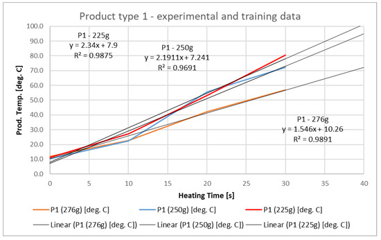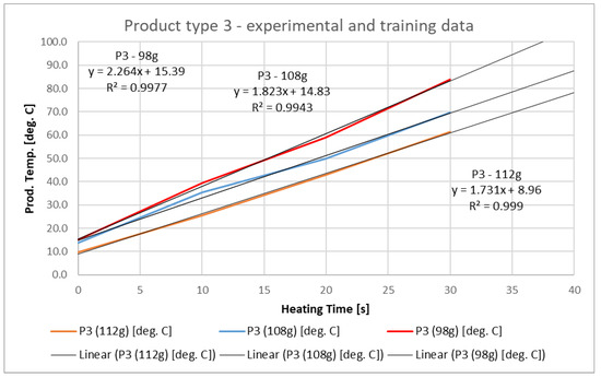 These figures (Figure 15, Figure 16 and Figure 17) graphically display the relationships between the product type, product mass, product temperature, and the corresponding heating time. Through these visualizations, patterns and trends can be observed, enabling the neural network to effectively learn and make accurate predictions based on these inputs. The experimental data, when combined with advanced machine learning techniques, play a pivotal role in refining the HTNNC’s ability to precisely determine the optimal heating time for each unique food product, contributing to the overall efficiency and quality.