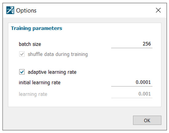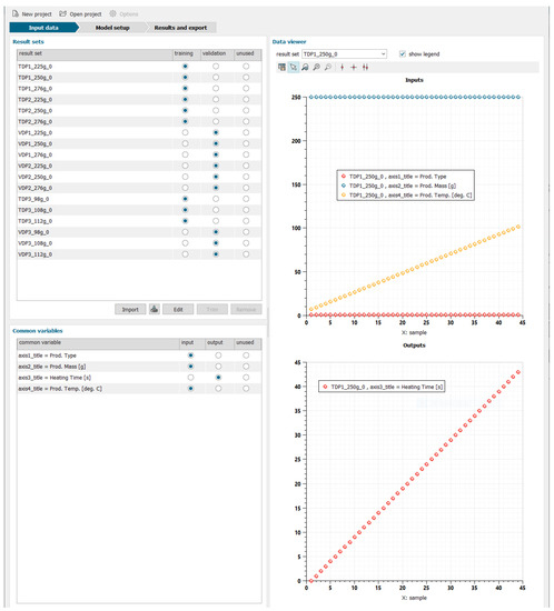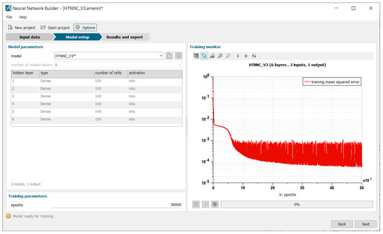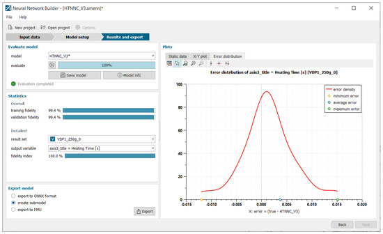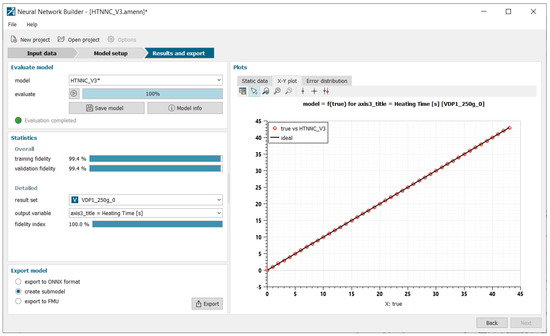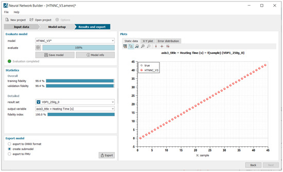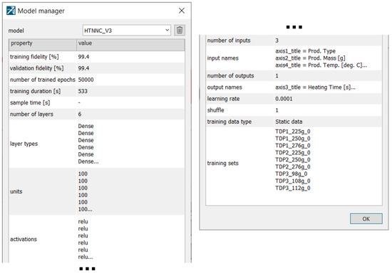Figure 21 provides additional information about the trained neural network model; showcasing the model manager for HTNNC_V3, it provides a comprehensive overview of the neural network’s performance and architecture. The training fidelity and validation fidelity, both of 99.4%, underscore the remarkable accuracy achieved by the HTNNC_V3 model in predicting heating times for diverse food products. The model’s exceptional fidelity demonstrates its ability to generalize effectively and make precise decisions based on the input parameters [27]. The training duration of 533 s indicates the computational efficiency of the training process, ensuring fast and effective development of the model. The neural network’s architecture, consisting of six layers of dense type, each with 100 neurons activated by the rectified linear unit (ReLU) function, which is the most-used activation function [28], working well when the system shows saturated behavior, enables the model to capture complex relationships and patterns within the input data. Overall, the ReLU has become the preferred choice for most hidden layers in modern neural networks due to its simplicity, effectiveness, and ability to tackle gradient issues by mitigating the vanishing gradient problem [29].
