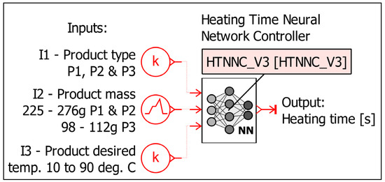 Following the neural network model’s successful validation, this model was exported as a submodel, which was integrated in the numerical simulation no. 2 that is presented in Figure 25. This figure showcases the simulation network of the completed HTNNC, which is responsible for controlling the heating time of the food products in the microwave oven.