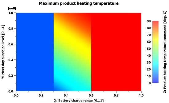 Figure 26 represents a complex result from the first numerical simulation, the EMC. The graph plots the battery charge range with values between zero and one on the X-axis, next-day sunshine level with values between zero and one on the Y-axis, and the product heating temperature command in °C on the Z-axis, depicted in various colors. This visualization offers a comprehensive understanding of how battery charge and predicted next-day sunshine levels limit the product heating temperature command, providing essential insights into the interplay between energy availability and maximum heating temperatures of the food products. Also in the same figure, one can see how, regardless of the next-day sunshine level, if the batteries are discharged below 30%, the vending machine will deliver unheated food products to keep enough energy for the refrigeration unit. On the other side, if the batteries are charged above 60%, the vending machine will deliver the food heated to the temperature the customer wants, but not higher than 90 °C.