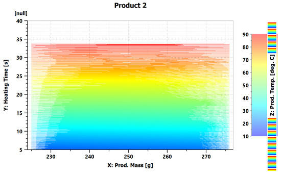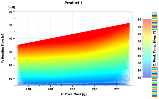 Graphing product mass in grams on the X-axis, heating time in seconds on the Y-axis, and product temperature in °C in color on Z-axis, Figure 15 illustrates the relationship between these variables for product 1. The visual representation showcases how variations in product mass and heating time impact the resulting product temperature, offering valuable insights into the heating process’s dynamics and efficiency.