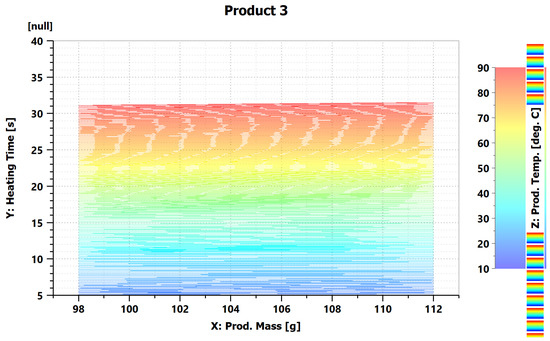 Figure 29 presents the heating process for product 3, mirroring the format of Figure 27 and Figure 28. By visualizing the relationship between product mass, heating time, and product temperature, this figure sheds light on how the heating characteristics differ for product 3 compared to the other two products.