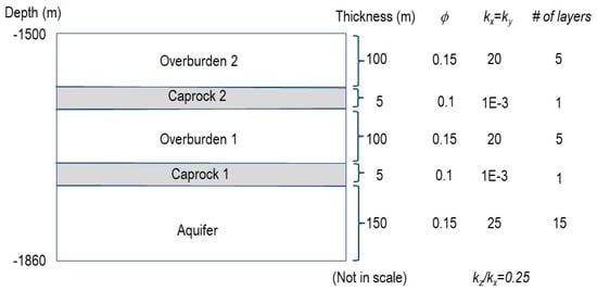 Homogeneous porosity (0.15 for the aquifer and overburdens and 0.1 for the caprock) and perm (25 md for the aquifer, 20 md for the overburden, and 1 × 10−3 md for the caprock) were assigned. Reservoir temperature and pressure were set to be isothermal at 60 °C and hydrostatic (178.36 bar at a depth of 1820 m). Vertical anisotropy of permeability (kz/kx) was assumed to be 0.25.