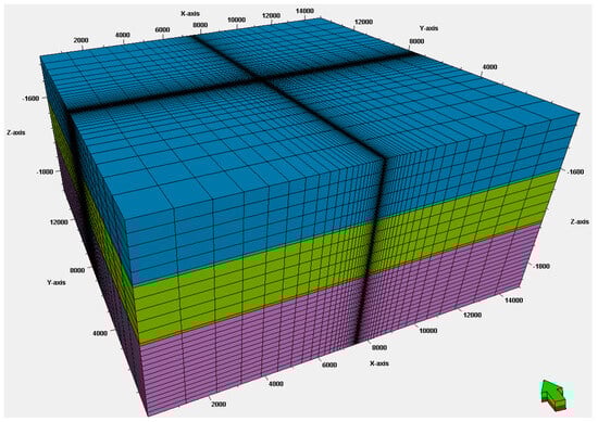 A simple layer cake 3D model was built for this study using SLB’s Petrel software platform. The model contains a sandstone aquifer body overlain by two shale caprock and two sandstone overburden intervals, with a tartan grid system centered on the single injection well. The dimensions and layering of the model are detailed in Figure 1 and Figure 2. The 3D model consists of a total of 75,843 cells (53 × 53 × 27) encompassing 15 km laterally and 360 m vertically. Applying the Tartan grid configuration, the smallest cell size in the center of the model domain is 15 m laterally and increases up to 1242.1 m in the furthest. The thickness of the storage formation and two overburden zones is 100 m each, and the caprock is 5 m thick. The vertical thickness of a cell is 5 m in the caprock, 10 m in the storage formation, and 20 m anywhere else (Figure 1). The depth to the top of the storage reservoir is 1710 m. An infinite open boundary condition was assumed with the application of a large pore volume multiplier (1 × 106) to the cells along the model boundary.