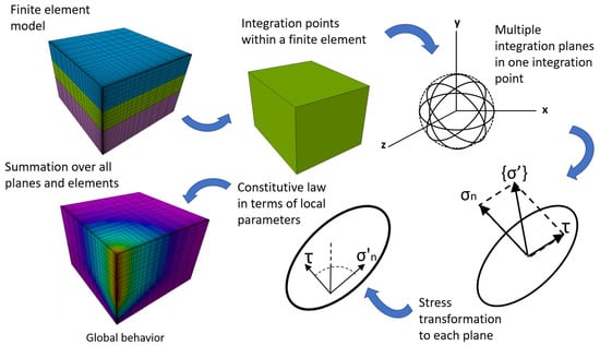 Adopting this multilaminate framework together with the Mohr–Coulomb constitutive model allows for the inclusion of the fractured rock’s mechanical behavior along various predefined planes that are randomly oriented, in a straightforward manner without mathematical complexity.