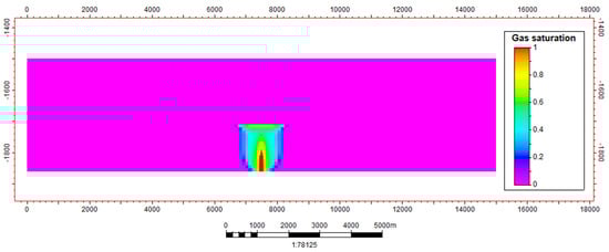 In all simulations, supercritical-phase CO2 was injected into the aquifer continuously for 10 years with the rate of 1 MMt/year from 1 January 2017, totaling 10,000,000 metric tons. Numerical simulations were performed using the SLB ECLIPSE* reservoir simulator with the CO2STORE module [34]. We assumed that the injection well was fully perforated through the target formation. The simulated results were collected and post-processed to obtain the dependent variables for the regression and assessment. Figure 4 shows the simulated CO2 plume distribution of base case 1 in the 8th year after the CO2 injection activity began.
