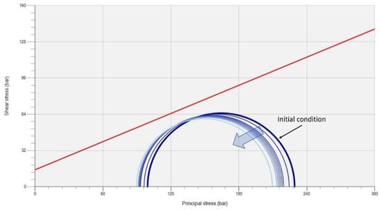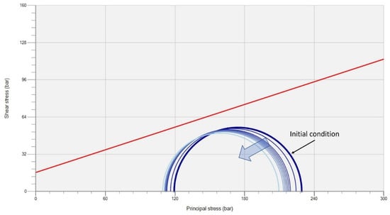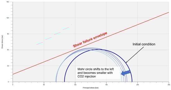 Mohr circle diagram of (b) in Figure 24. Mohr circle becomes smaller with injection, but its distance to the shear failure envelope (red line) remains constant.