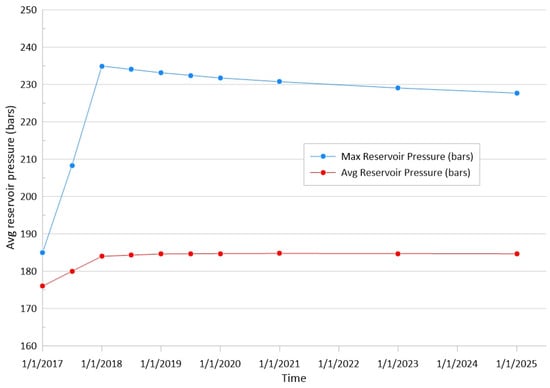 Maximum and average reservoir pressure from the Eclipse simulation.