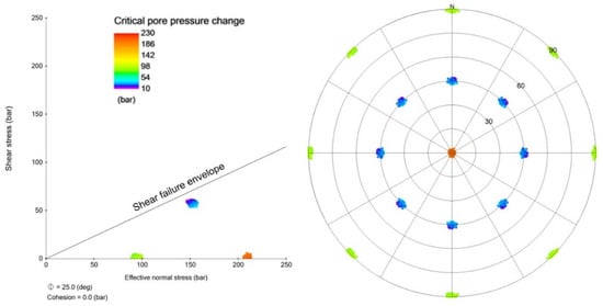 Fracture stability analysis of multilaminate planes within the Caprock 1 layer. The left image displays the shear vs. effective normal stress of the multilaminate planes, while the right image presents a stereonet plot of the multilaminate planes. Both images are color-coded with the critical pore pressure change needed to induce failure along the multilaminate planes.