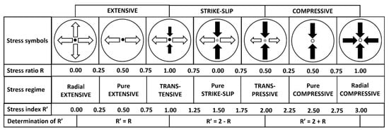 In addition to the elastic and mechanical properties, stress regime was also considered as an independent variable. The stress regime can be defined by the stress index R’ as defined by Delvaux et al. [36], which considers the stress ratio R as a function of the principal stresses expressed with Equation (1).