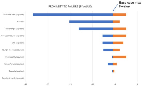 The sensitivity analysis results are summarized as a tornado chart in Figure 12, with the independent variables ranked by sensitivity based on the maximum F value (representing the closest proximity to failure). For reference, the base case scenario has a maximum F value of (−)5.91.
