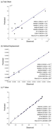 where is the mean of the observed data. R2 measures the degree of variation in the response that can be explained using the model. We initially established that models with an R2 value greater than 0.9 were acceptable based on our predefined criteria. However, if the R2 value did not exceed this threshold, we still considered the model acceptable, provided that the other goodness-of-fit measures indicated an acceptable tolerance level. For example, we determined the mean squared error (MSE), normalized MSE (NMSE), normalized root-mean-squared error (NRMSE), mean absolute relative error (MARE), coefficient of correlation (R), and coefficient of efficiency (COE) to further investigate whether the response model is statistically acceptable. Figure 15 shows the cross-plot of the simulated and predicted total strain, vertical displacement, and F value at t = 1 year with the goodness-of-fit measure results.