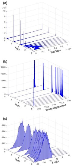 As described in the previous sections, we constructed an RSM associated with a four-factor BBD experimental design and performed the regression modeling with the stepwise regression method on the outcomes (responses) from the specified numerical runs. After building the regression models for each dependent variable at each time, we performed the Monte Carlo simulation with the fitted regression equation at each time. The post-processing of the results includes the collection of the dependent variables (y = vertical displacement, total strain, and F value) for the assessment of geomechanical risk analysis.