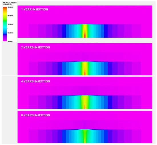 Given the design of the experiment specified with the BBD for four independent variables, we performed numerical modeling work for 25 cases. For the initial conditions of the model, we assumed that the model was fully saturated with water. A hydrostatic pressure (P = ρwgh) ranging from 148.26 bars to 181.76 bars was initially assigned according to the formation depth. Reservoir temperature was assumed to be isothermal. The assigned pressure field and temperature values maintained the injected CO2 in its supercritical phase within the model domain.