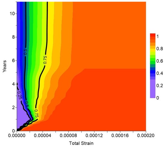 Contour map of the CDFs for total strain. The 0.5 contour highlighted with a thick black line is the best estimated linear trend in the equivalent total strain from the simulation.