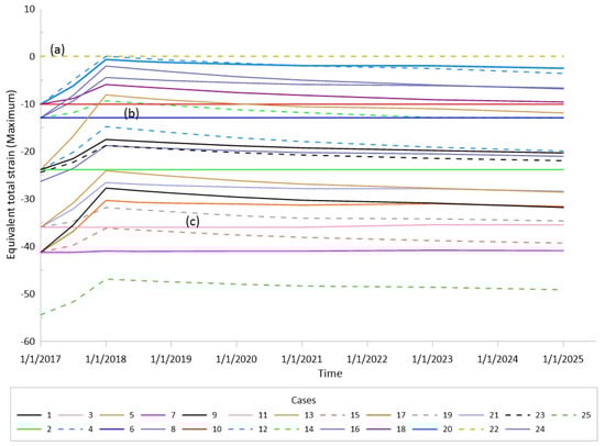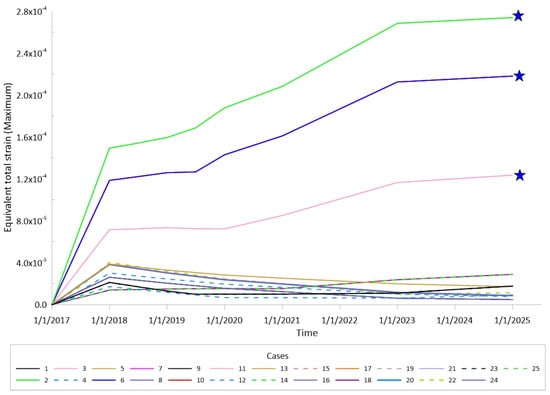 The 75 percentile (P75) above the equivalent total strain was projected to slightly increase after 1 year of injection. Figure 21 illustrates the plot of the maximum equivalent total strain in Caprock 1 for all 25 cases in the BBD. For the vast majority of the cases, the maximum equivalent total strain peaked after 1 year of injection and then decreased before stabilizing after 3 years. However, a small subset of cases (marked with a blue star) show a distinctly different behavior. Their maximum equivalent total strain continued to increase after 1st year of injection, resulting in the divergent pattern noted for P75 and above in Figure 20. On closer examination, these cases represent factorial combinations where the Young modulus of the caprock is at its minimum value (6 Gpa) within its statistical distribution. A low Young’s modulus allows for more ductile behavior, and thus the caprock can accommodate further deformation (strain) beyond the 1st year of injection as marked by star symbols in Figure 21.