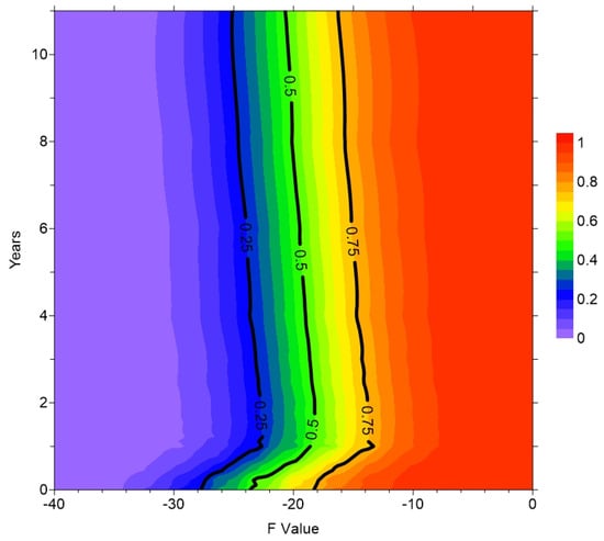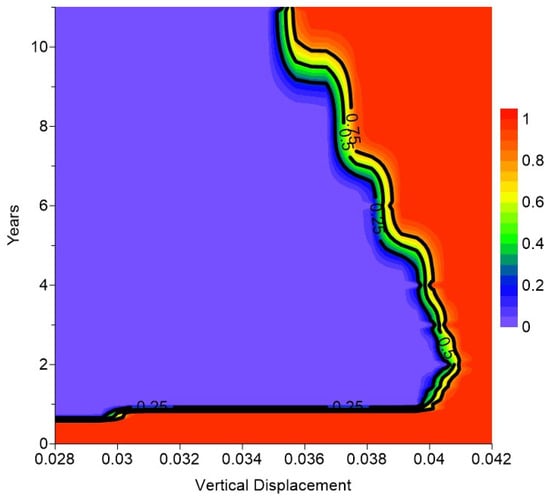 Figure 16 presents the series of independent probability density functions (PDFs), each obtained at specific times for the total strain, vertical displacement, and F value. The smooth transition within the PDFs was achieved through appropriate adjustments in the output interval, facilitating the interpolation of probability distribution functions from one time point to the next. As the dependent variables underwent significant changes due to caprock failure during the 1-year injection period, it was imperative to decrease the output interval during and immediately following the injection period. Consequently, the temporal evolution of the probability distribution functions was plotted for each dependent variable, providing a comprehensive final result.