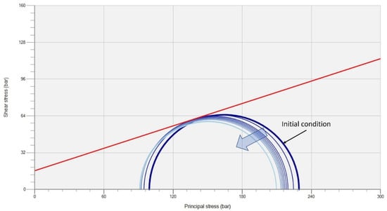 Mohr circle diagram for (a) in Figure 24. Mohr circle at the initial condition and all time steps intersect the shear failure envelope (red line).