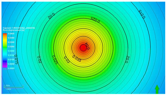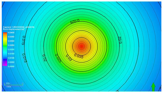 Vertical displacement map (top view) of Caprock 1 at the end of 1-year injection (base case).