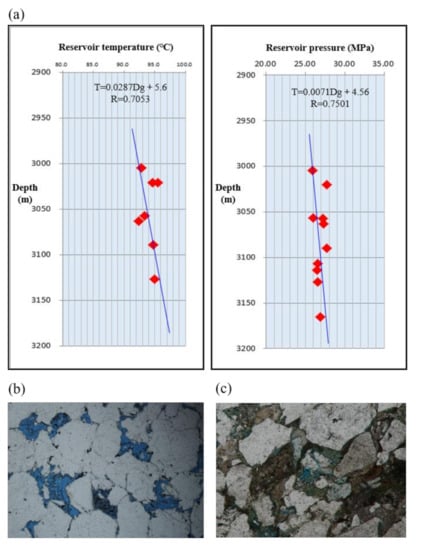 Temperature and pressure characteristics and typical secondary pores of the Xiashihezi formation. (a) The changes in temperature and pressure at different formation depths. (b) Intergranular pores. (c) Intragranular pores.