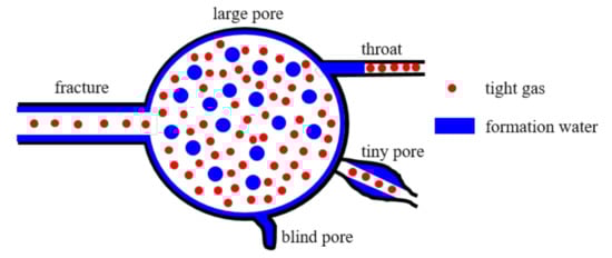 The primary source of water production in the Dongsheng gas field is pore water. Initially, there is no water production in the early stages of gas well operation, but significant water production occurs during the later stages of development. Formation water within tight reservoirs is classified into movable water and connate water based on their occurrence characteristics, as shown in Figure 3. Movable water is found in large pores, voids, and fractures, enabling it to move freely under specific pressure differentials. It is primarily located in reservoirs characterized by well-developed pore structures, such as the lower sections of the main channel structure, and in the form of lens-like permeable sand bodies. Connate water primarily exists in the corners of rock particle contacts, micropores, or is adsorbed onto the surface of rock framework particles. Due to its unique distribution state, this portion of water usually cannot move freely.